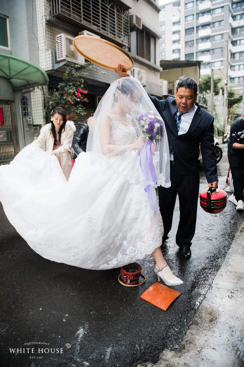 新娘與父母拜別後,新娘會由一位好命婆或媒人手持米篩護送上禮車,這時新娘會丟出兩把扇子,一把代表新娘的好脾氣,一把為新娘的壞脾氣,離開娘家前將壞脾氣留在娘家,將好脾氣帶過去夫家,未來做個得人疼的好媳婦,潑水會由母親將水潑出去,『嫁出去的女兒,像是潑出去的水』相信是許多人的印象,但其實是帶有祝福的意義,像是水潑的越高越遠,表示新娘與娘家的感情緣分好,嫁過去會好命。
