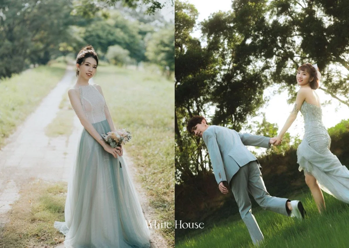 灰藍色向來是 #婚紗顏色推薦 的高級系代表。它不像粉色那樣甜美,也不像黑色那樣銳利,而是一種溫柔中帶著距離感的浪漫色彩。低調、耐看又不容易撞色,不管是拍婚紗、文定還是宴客,都能穿出優雅又獨特的氣場。